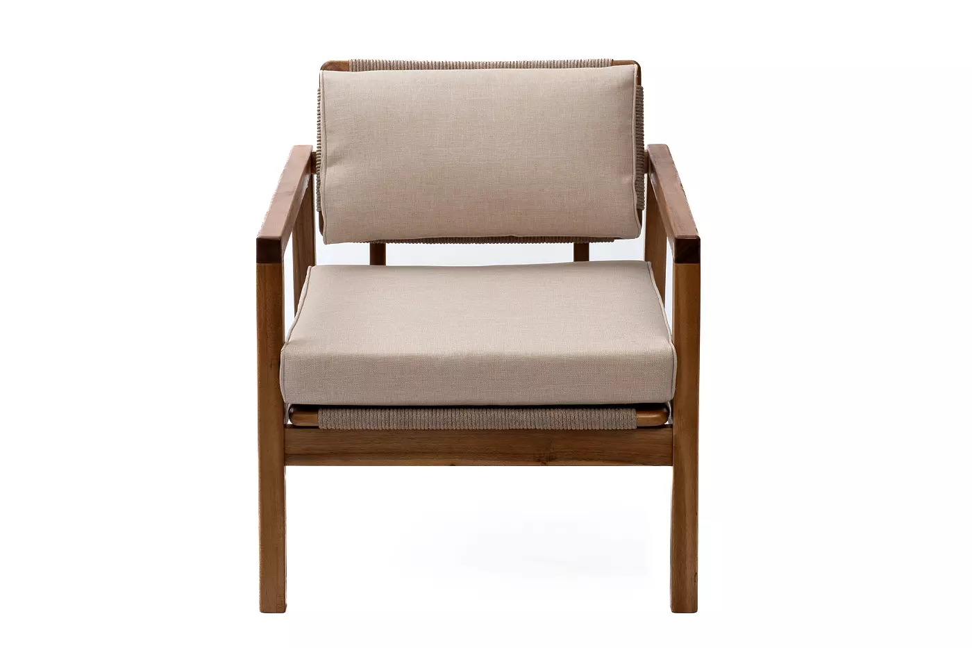 Элегантное садовое кресло из коллекции CALISTO — сочетание натурального массива акации, стильного веревочного плетения и комфортных подушек. Идеален для веранд, террас и зон отдыха на открытом воздухе.