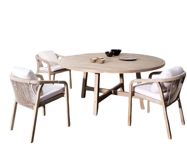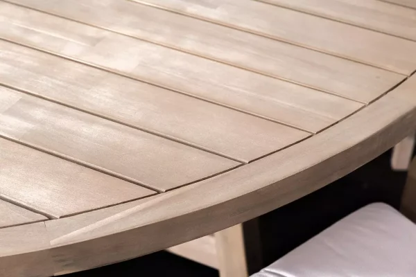 Элегантный круглый обеденный стол из коллекции RIMINI — сочетание современного дизайна и природной красоты древесины. Модель идеально подходит для просторных обеденных зон на террасе, веранде или в саду.
