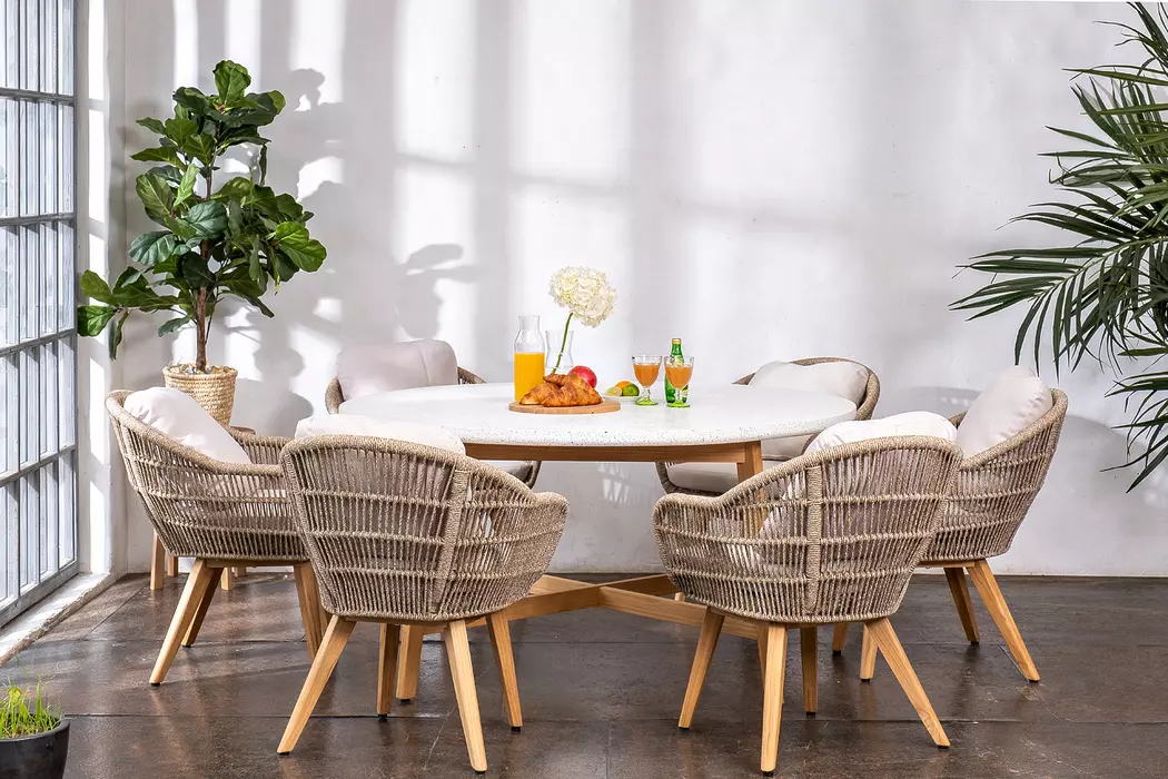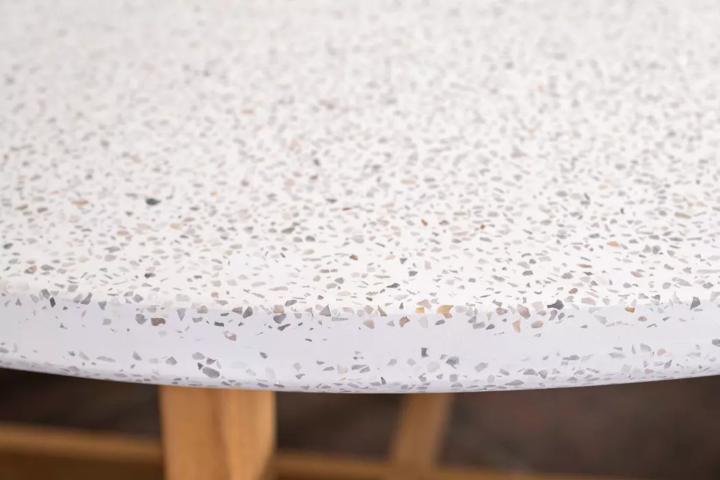 Элегантный круглый обеденный стол из коллекции TALARA — сочетание природной красоты тика и современных материалов. Модель с керамогранитной столешницей TERAZZO станет центральным элементом зоны отдыха на террасе, веранде или в интерьере.